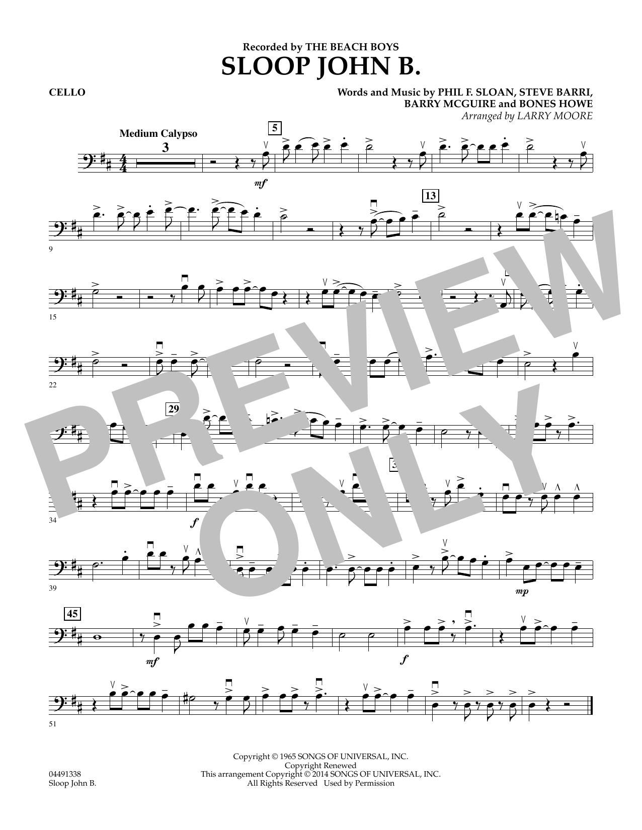 Download or print Larry Moore Sloop John B - Cello sheet music, chords and digital score arranged for Orchestra. This Folk score includes 1 page(s).