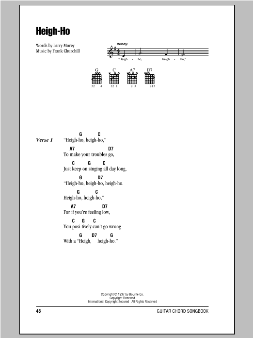 Download or print Larry Morey & Frank Churchill Heigh-Ho (from Snow White And The Seven Dwarfs) sheet music, chords and digital score arranged for Easy Guitar Tab. This Children score includes 1 page(s).