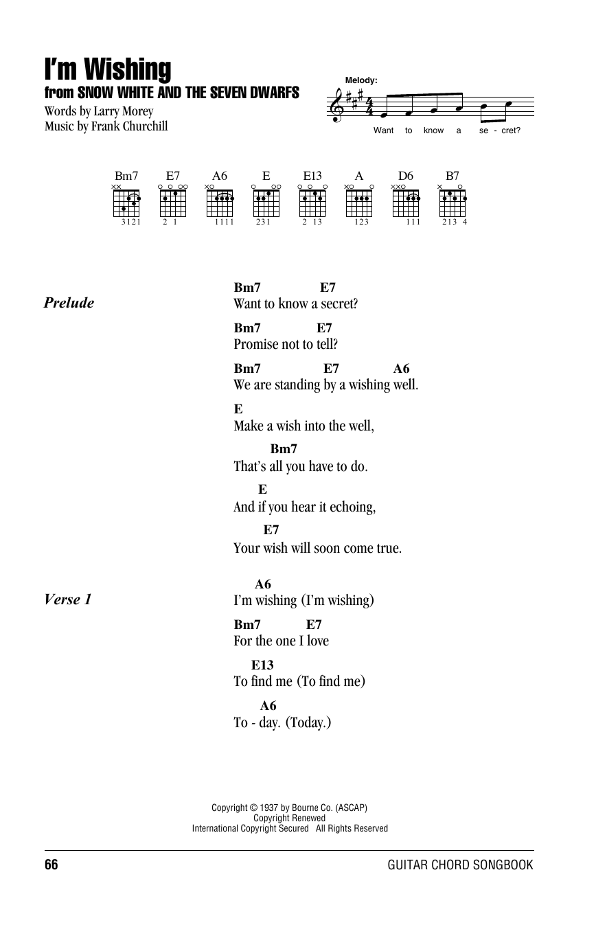 Download or print Larry Morey and Frank Churchill I'm Wishing (from Snow White and the Seven Dwarfs) sheet music, chords and digital score arranged for Piano, Vocal & Guitar Chords (Right-Hand Melody). This Children score includes 4 page(s).