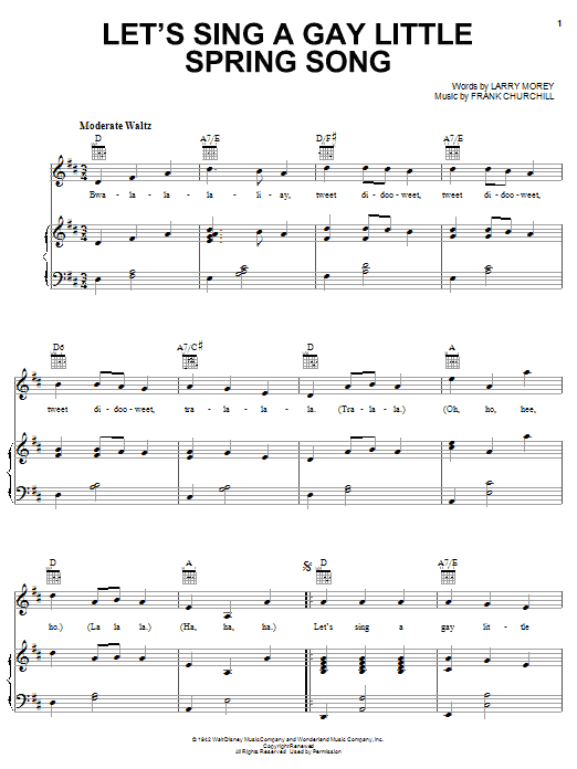 Download or print Larry Morey Let's Sing A Gay Little Spring Song sheet music, chords and digital score arranged for Piano, Vocal & Guitar Chords (Right-Hand Melody). This Children score includes 5 page(s).