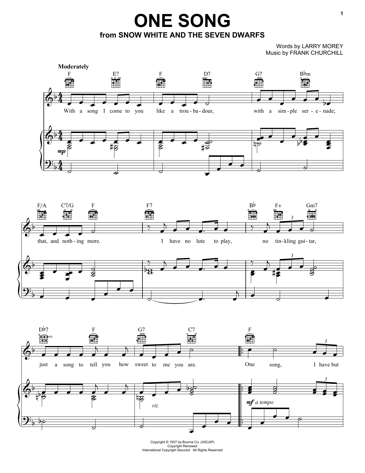 Download or print Larry Morey One Song sheet music, chords and digital score arranged for Piano, Vocal & Guitar Chords (Right-Hand Melody). This Children score includes 2 page(s).