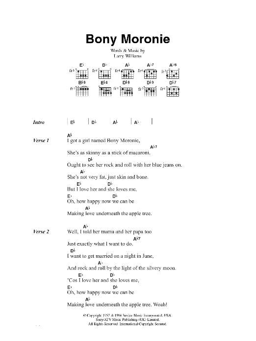 Download or print Larry Williams Bony Moronie sheet music, chords and digital score arranged for Lead Sheet / Fake Book. This Pop score includes 1 page(s).