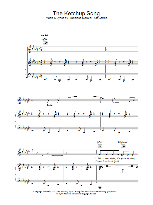 Download or print Las Ketchup The Ketchup Song sheet music, chords and digital score arranged for Piano Chords/Lyrics. This Pop score includes 2 page(s).