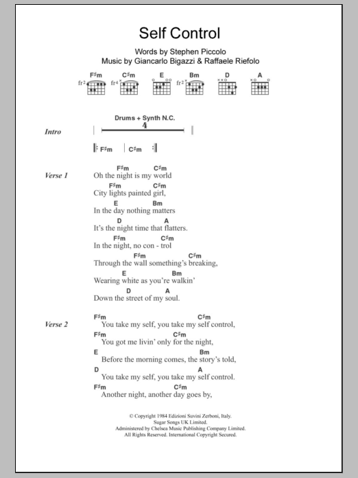 Download or print Laura Branigan Self Control sheet music, chords and digital score arranged for Guitar Chords/Lyrics. This Rock score includes 3 page(s).