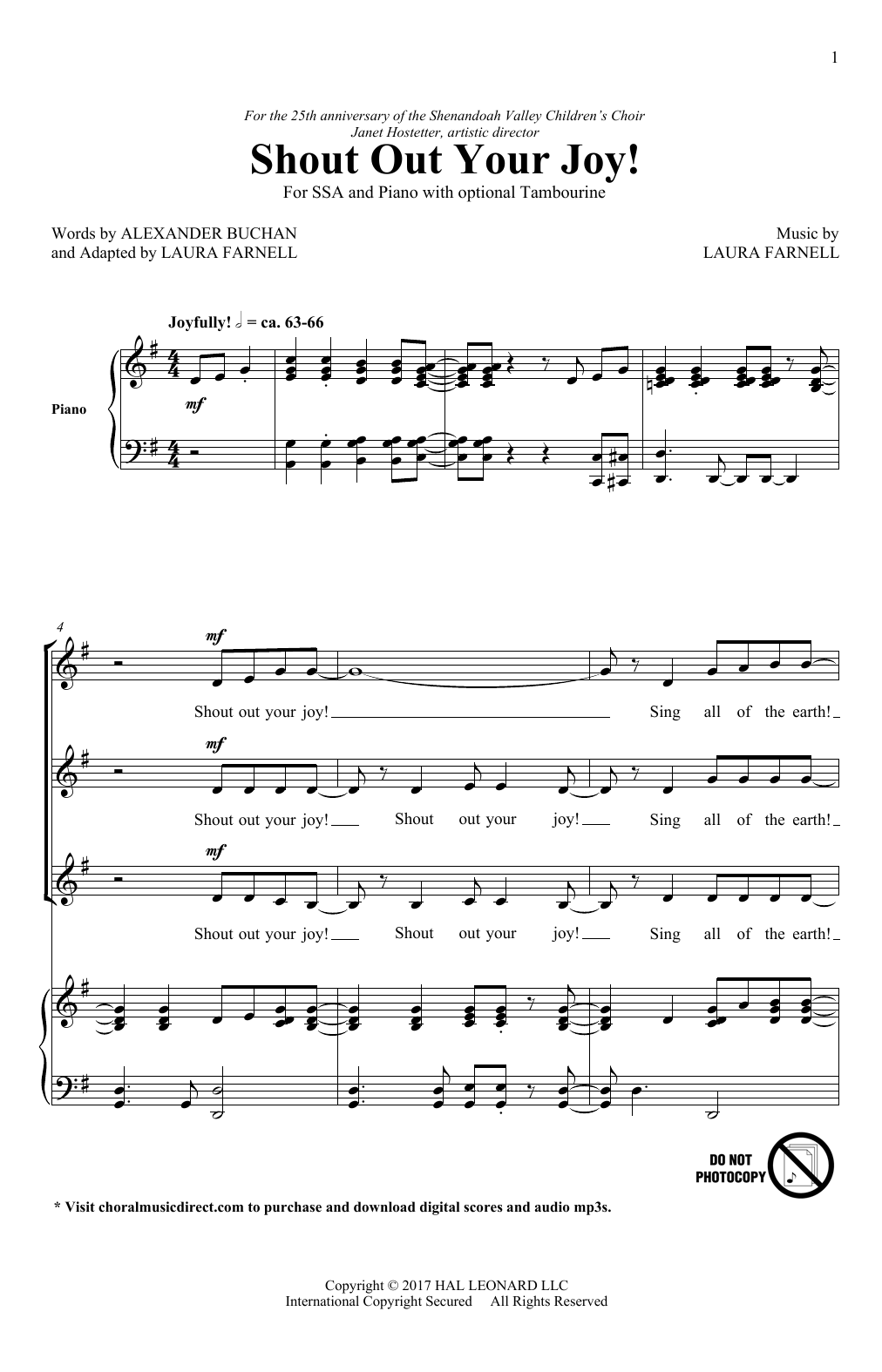Download or print Laura Farnell Shout Out Your Joy! sheet music, chords and digital score arranged for SSA Choir. This Concert score includes 15 page(s).