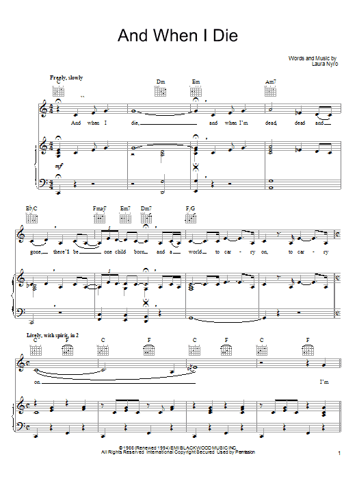 Download or print Laura Nyro And When I Die sheet music, chords and digital score arranged for Piano, Vocal & Guitar Chords (Right-Hand Melody). This Folk score includes 7 page(s).
