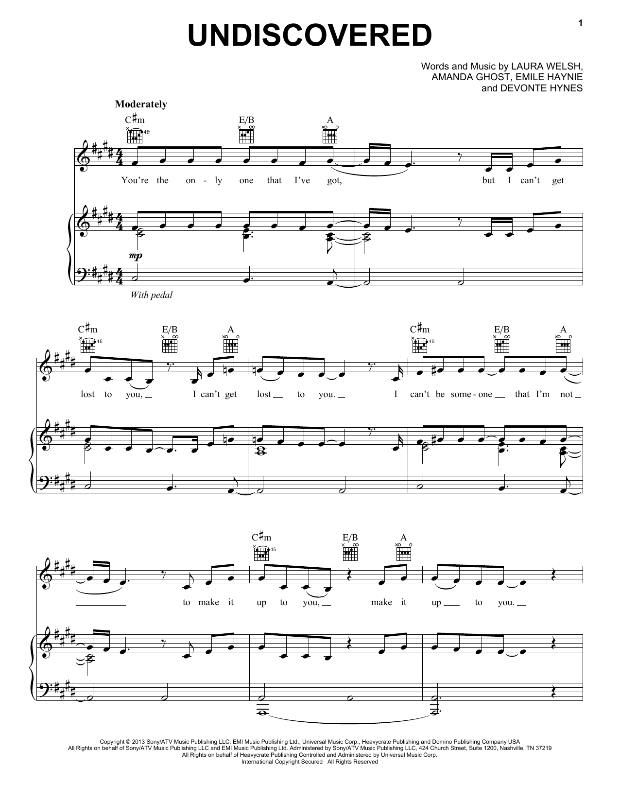Download or print Laura Welsh Undiscovered sheet music, chords and digital score arranged for Piano, Vocal & Guitar Chords (Right-Hand Melody). This Film/TV score includes 5 page(s).