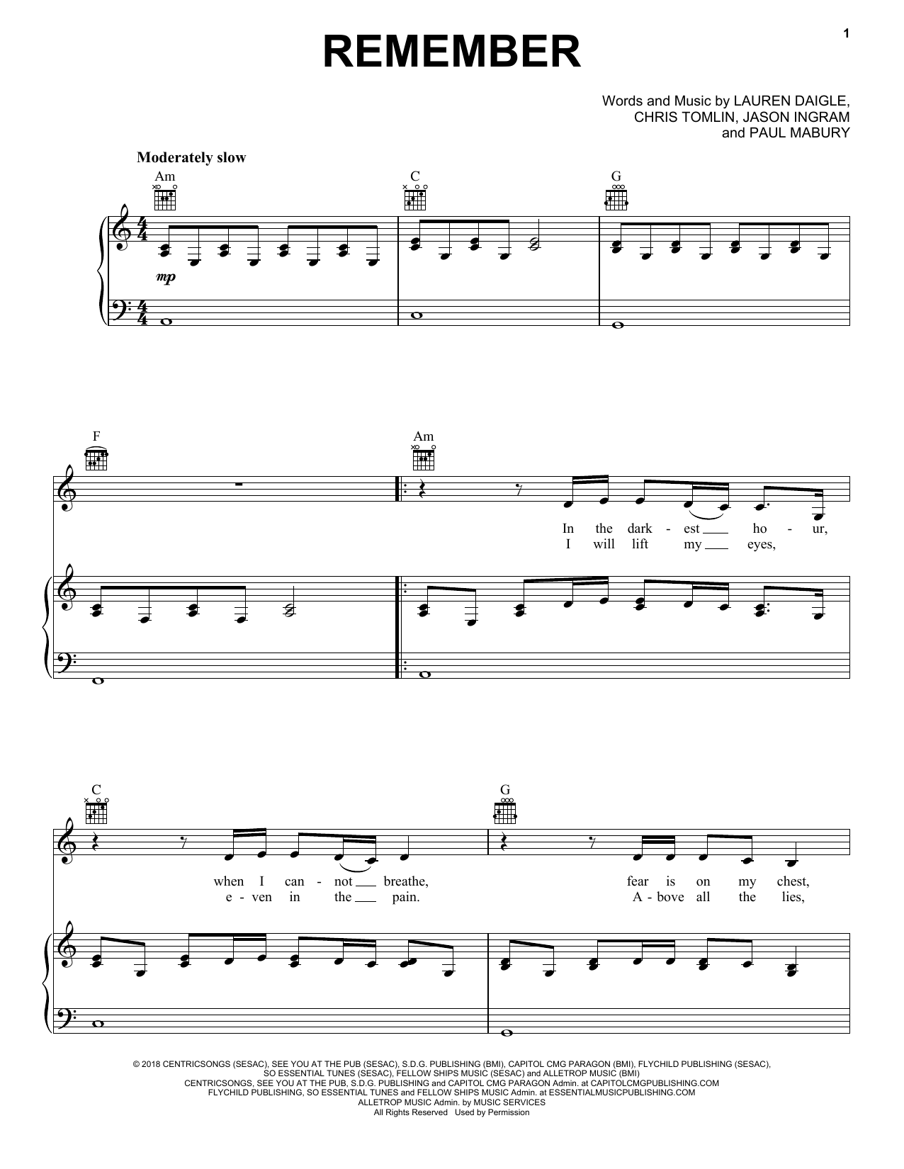 Download or print Lauren Daigle Remember sheet music, chords and digital score arranged for Piano, Vocal & Guitar Chords (Right-Hand Melody). This Pop score includes 6 page(s).