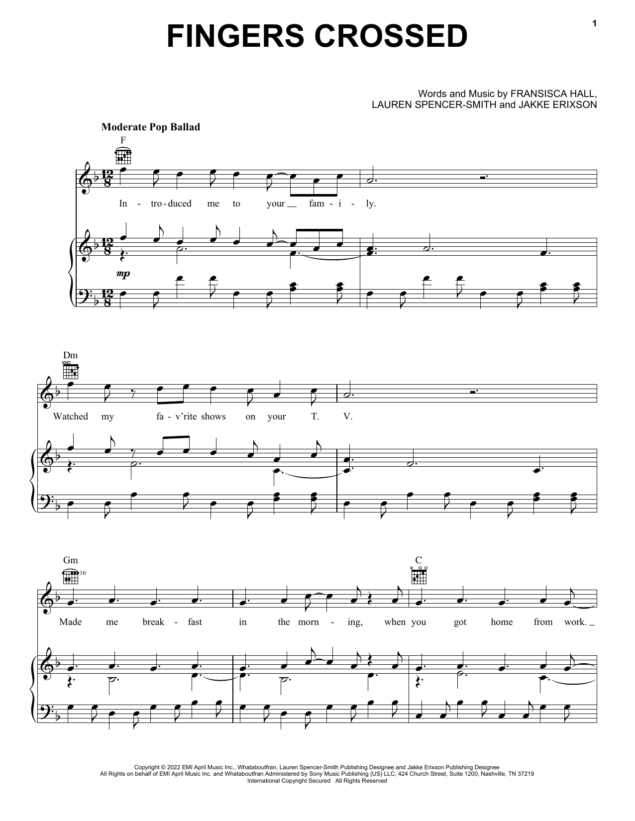 Download or print Lauren Spencer-Smith Fingers Crossed sheet music, chords and digital score arranged for Piano, Vocal & Guitar Chords (Right-Hand Melody). This Pop score includes 6 page(s).