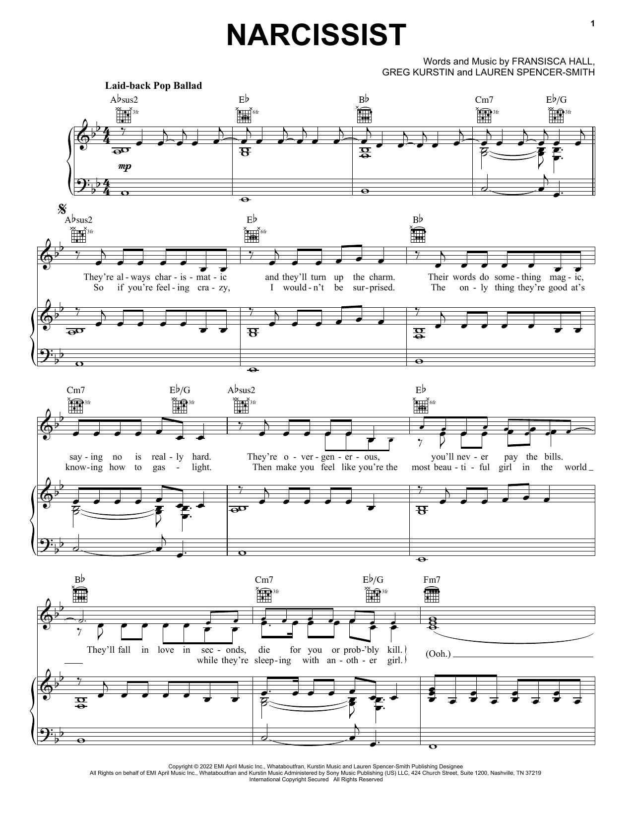 Download or print Lauren Spencer-Smith Narcissist sheet music, chords and digital score arranged for Piano, Vocal & Guitar Chords (Right-Hand Melody). This Pop score includes 4 page(s).