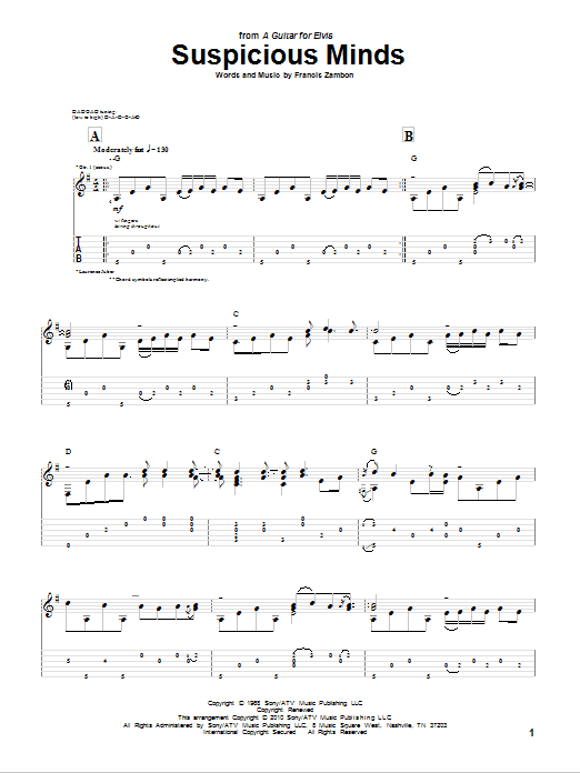 Download or print Laurence Juber Suspicious Minds sheet music, chords and digital score arranged for Guitar Tab. This Pop score includes 8 page(s).