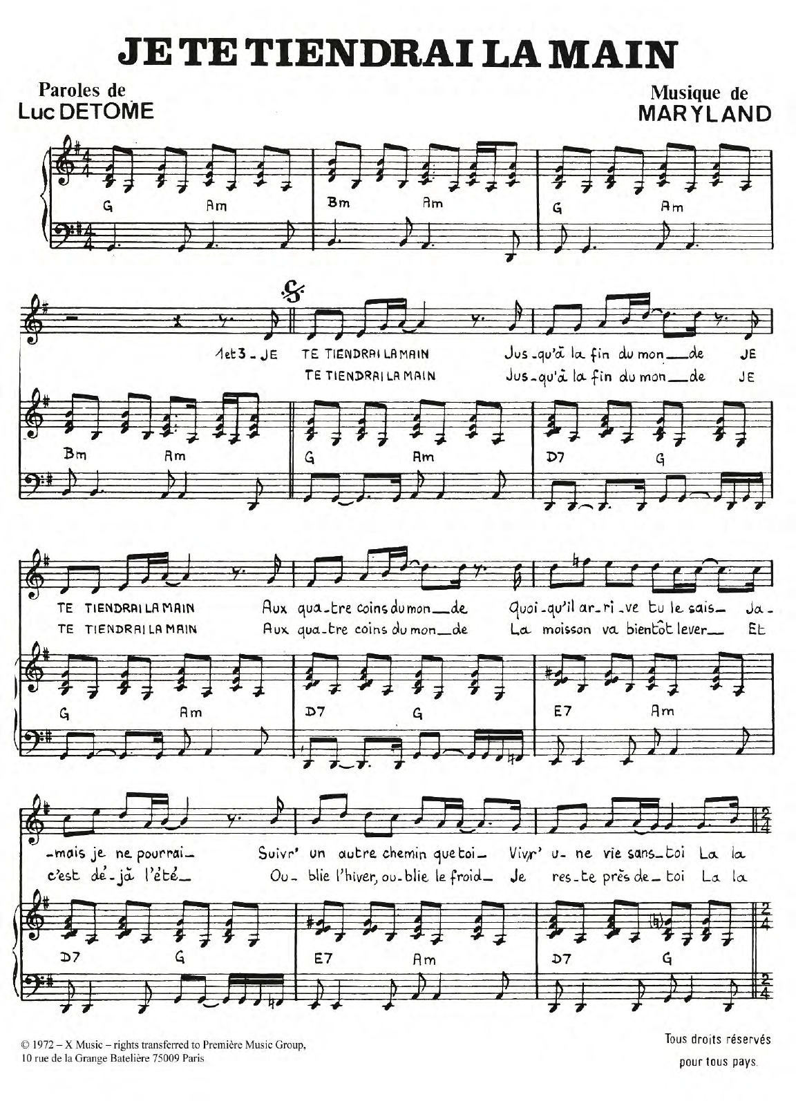 Download or print Laurent Rossi Je Te Tiendrai La Main sheet music, chords and digital score arranged for Piano & Vocal. This Pop score includes 2 page(s).