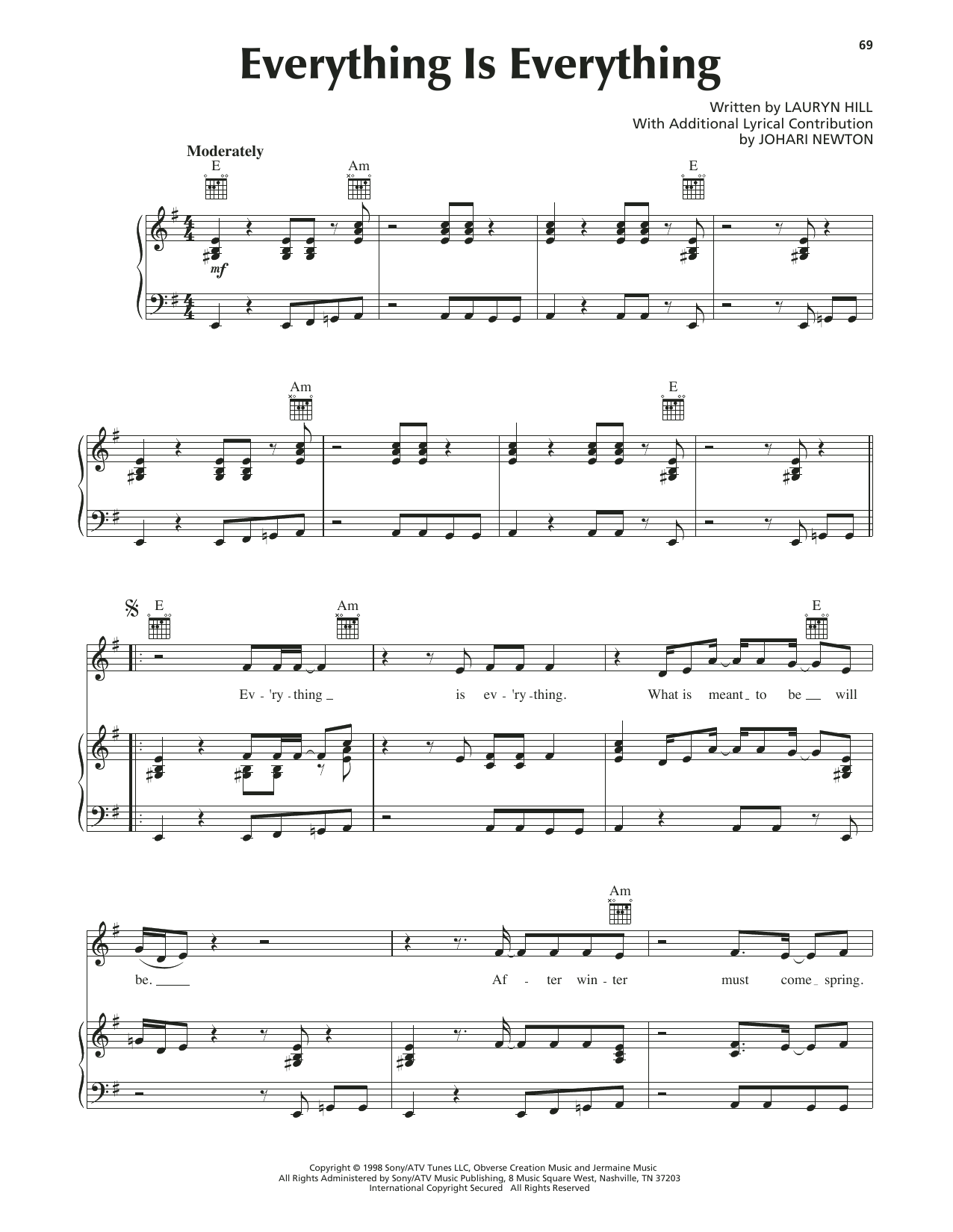 Download or print Lauryn Hill Everything Is Everything sheet music, chords and digital score arranged for Piano, Vocal & Guitar Chords (Right-Hand Melody). This Pop score includes 7 page(s).