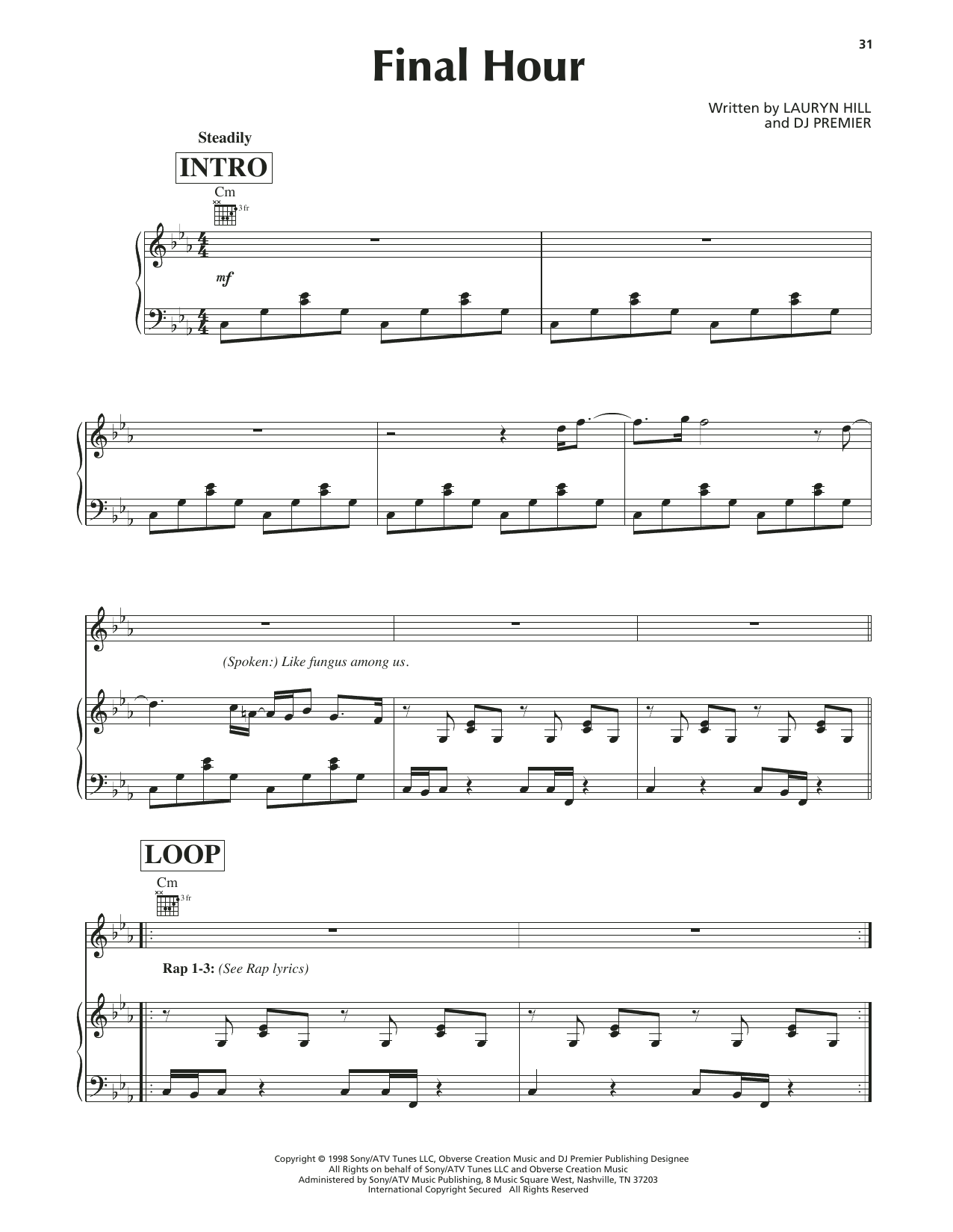 Download or print Lauryn Hill Final Hour sheet music, chords and digital score arranged for Piano, Vocal & Guitar Chords (Right-Hand Melody). This Pop score includes 6 page(s).