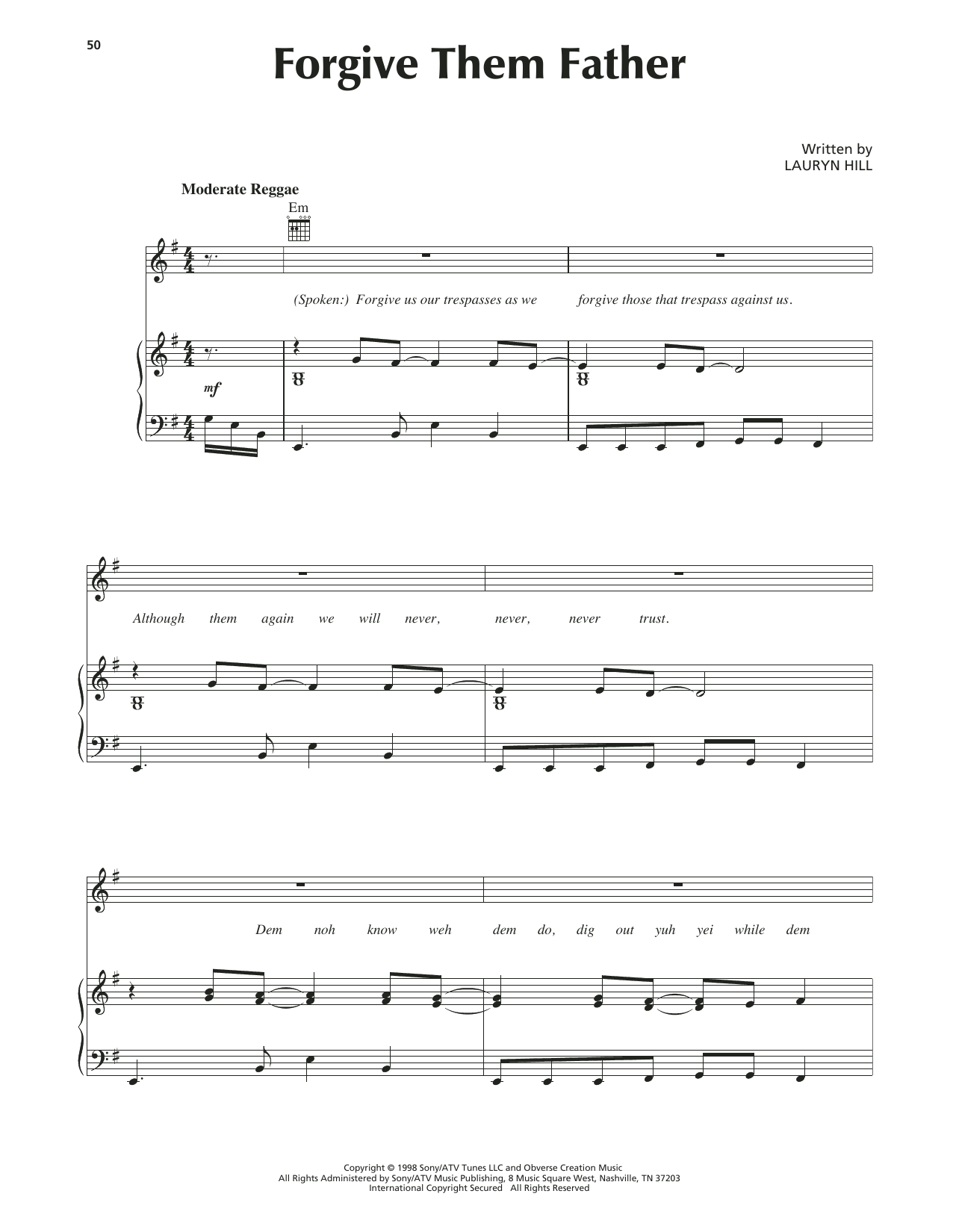 Download or print Lauryn Hill Forgive Them Father sheet music, chords and digital score arranged for Piano, Vocal & Guitar Chords (Right-Hand Melody). This Pop score includes 7 page(s).
