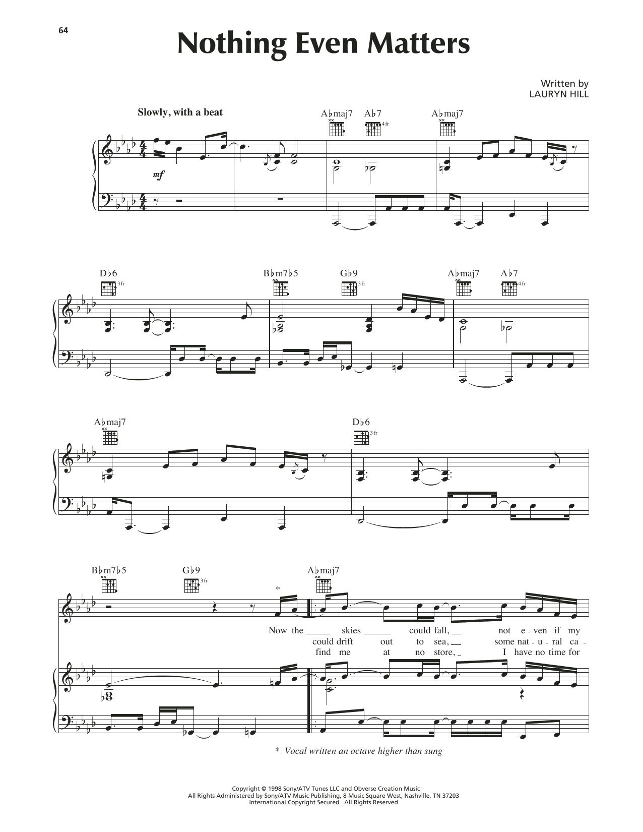 Download or print Lauryn Hill Nothing Even Matters sheet music, chords and digital score arranged for Piano, Vocal & Guitar Chords (Right-Hand Melody). This Pop score includes 5 page(s).