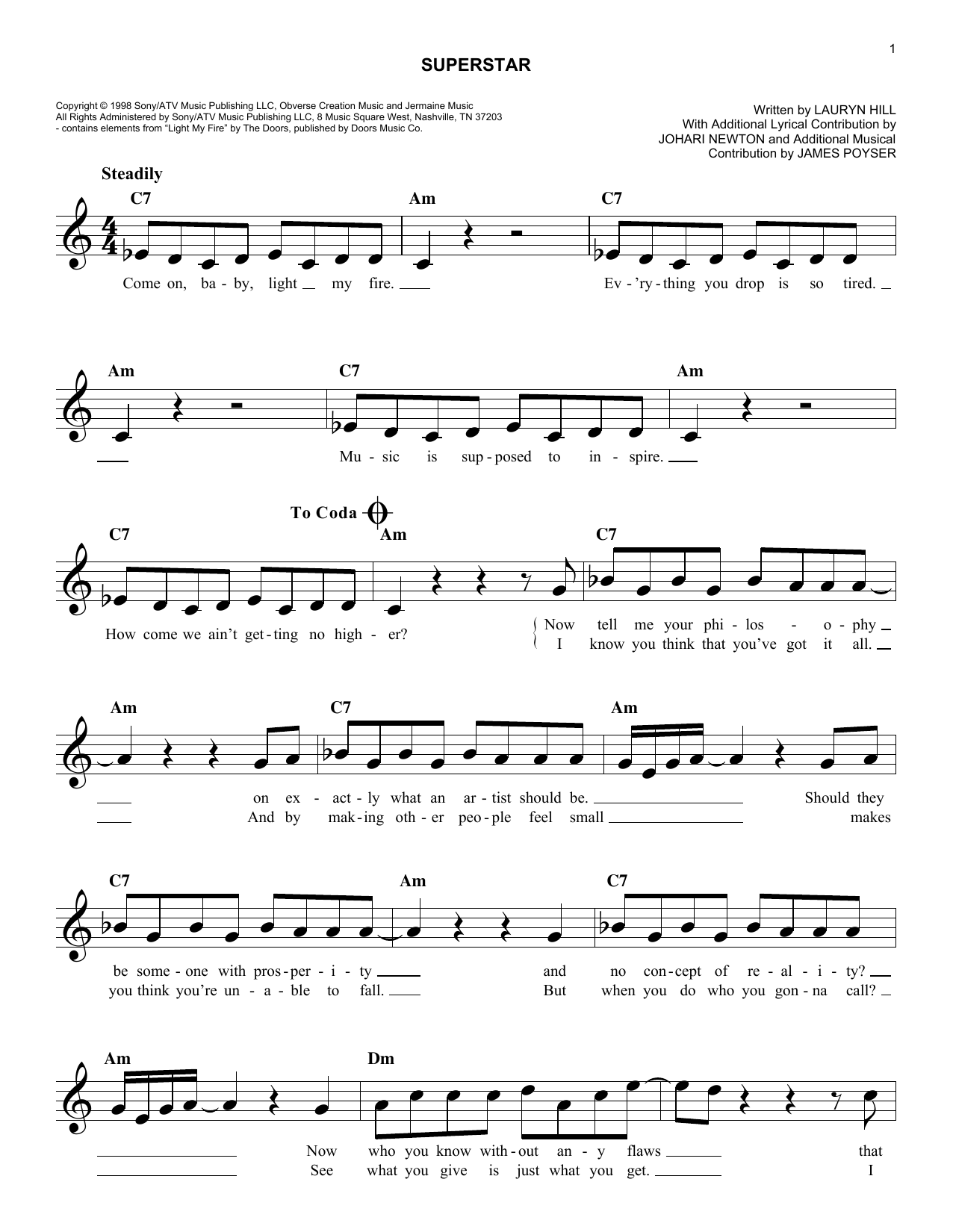 Download or print Lauryn Hill Superstar sheet music, chords and digital score arranged for Piano, Vocal & Guitar Chords (Right-Hand Melody). This Pop score includes 6 page(s).