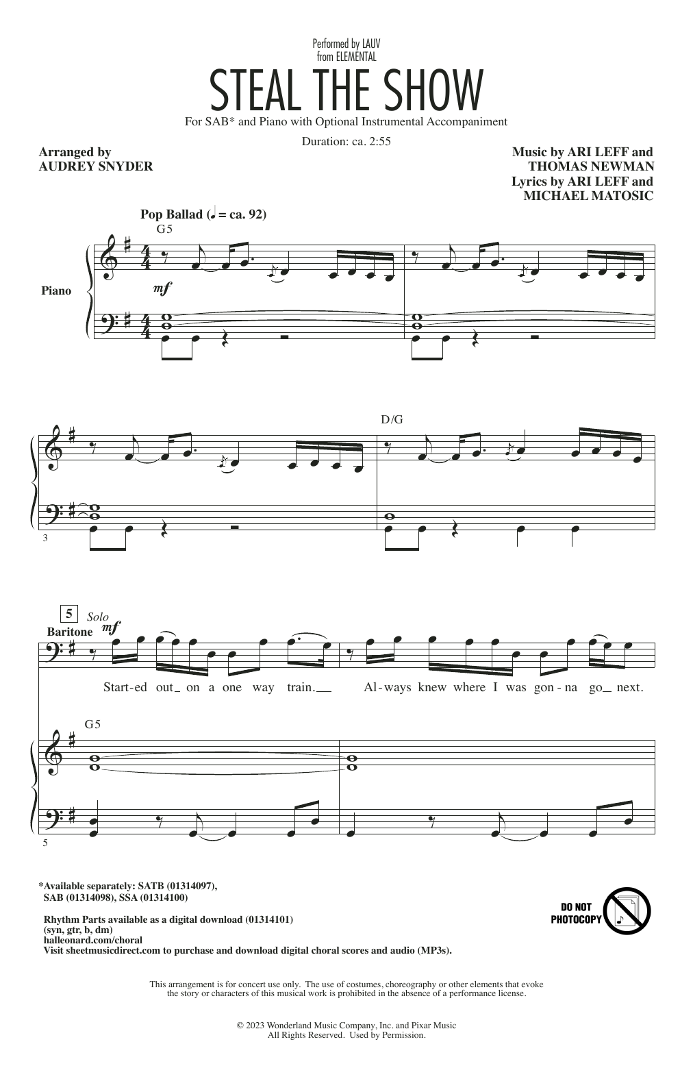 Download or print Lauv Steal The Show (from Elemental) (arr. Audrey Snyder) sheet music, chords and digital score arranged for SAB Choir. This Disney score includes 10 page(s).