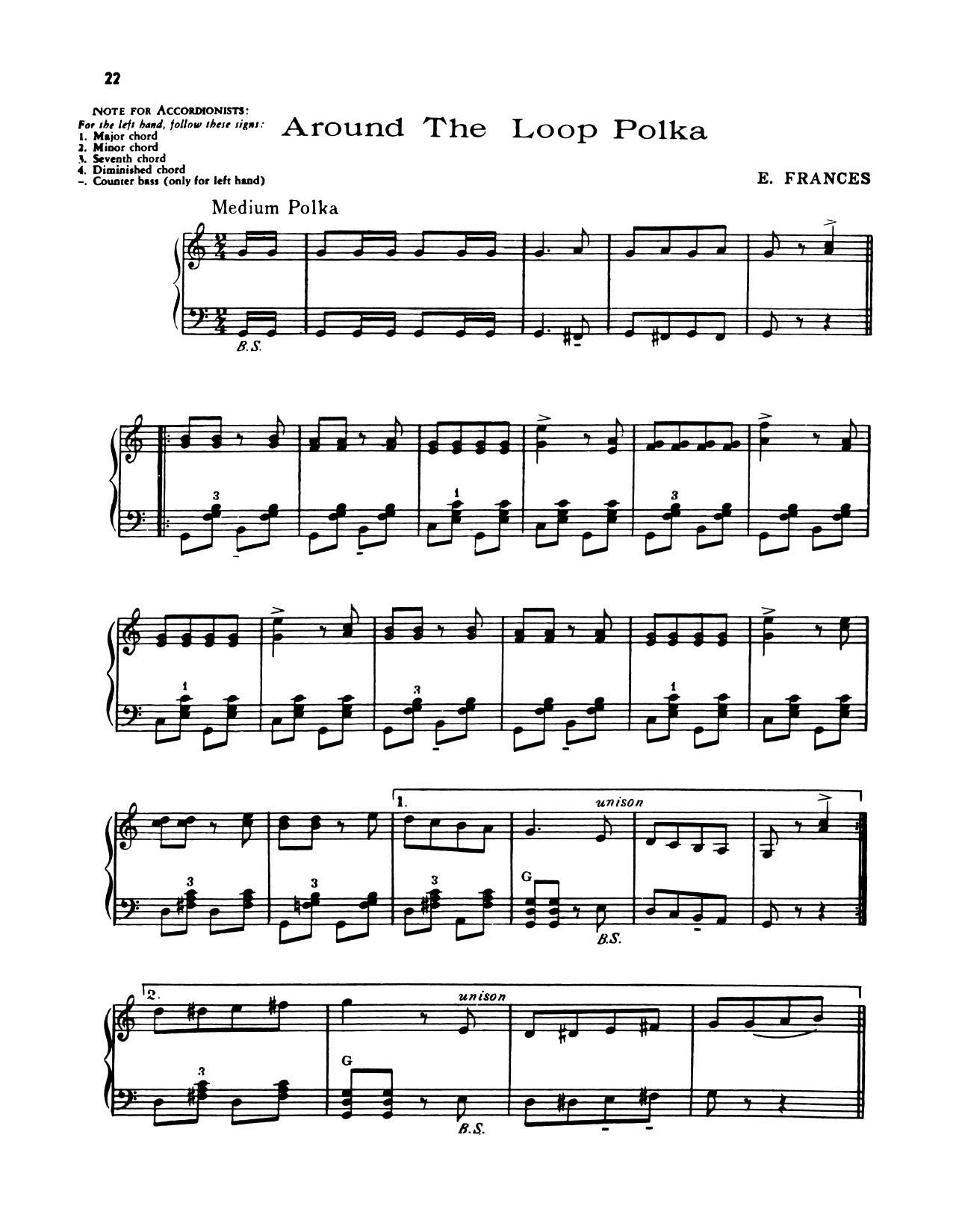 Download or print Lawrence Welk Around The Loop Polka sheet music, chords and digital score arranged for Piano Solo. This Polka score includes 3 page(s).