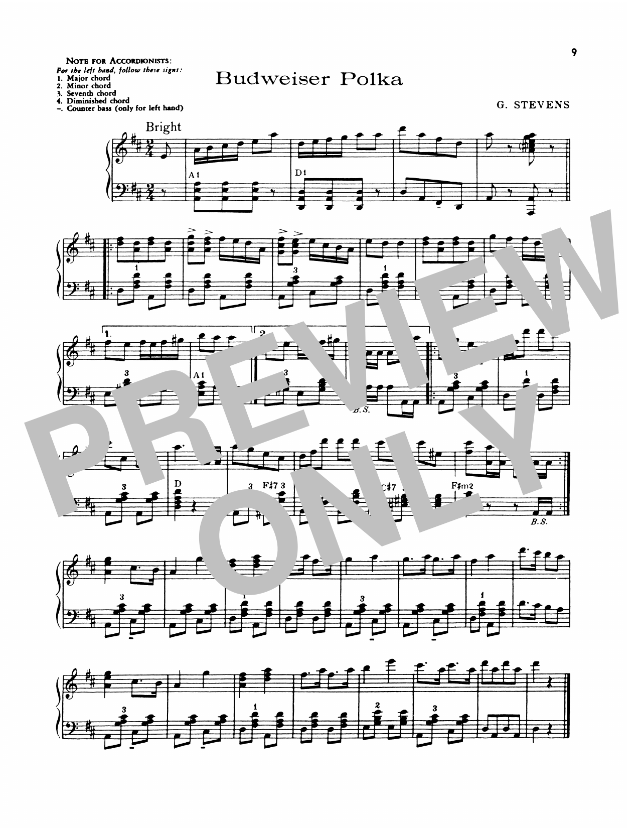 Download or print Lawrence Welk Budweiser Polka sheet music, chords and digital score arranged for Piano Solo. This Polka score includes 1 page(s).