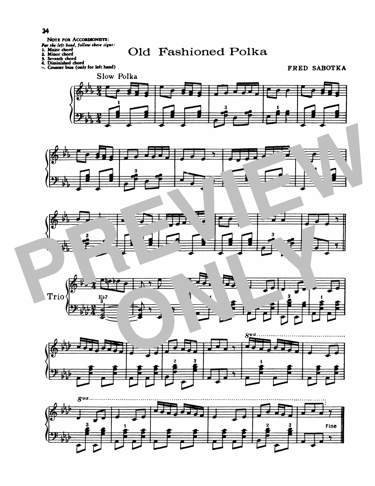Download or print Lawrence Welk Old Fashioned Polka sheet music, chords and digital score arranged for Piano Solo. This Polka score includes 1 page(s).