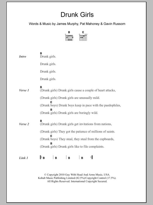 Download or print LCD Soundsystem Drunk Girls sheet music, chords and digital score arranged for Guitar Chords/Lyrics. This Pop score includes 3 page(s).