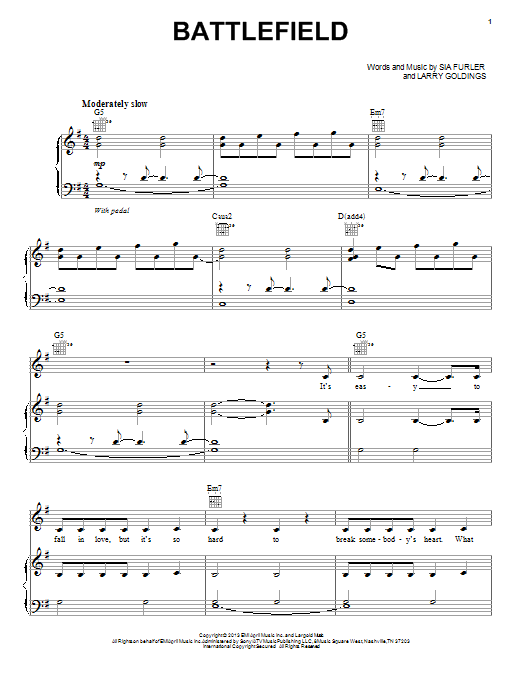 Download or print Lea Michele Battlefield sheet music, chords and digital score arranged for Piano, Vocal & Guitar Chords (Right-Hand Melody). This Pop score includes 7 page(s).