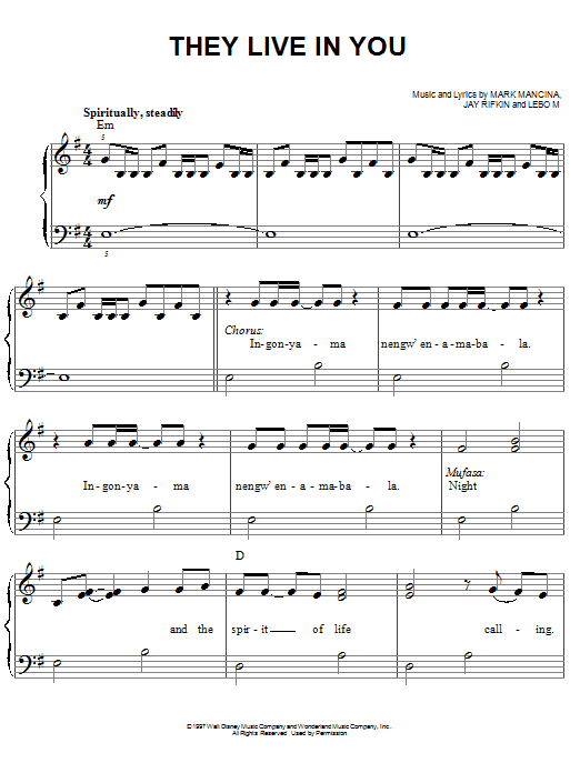 Download or print Lebo M They Live In You (from The Lion King: Broadway Musical) sheet music, chords and digital score arranged for Easy Piano. This Disney score includes 6 page(s).