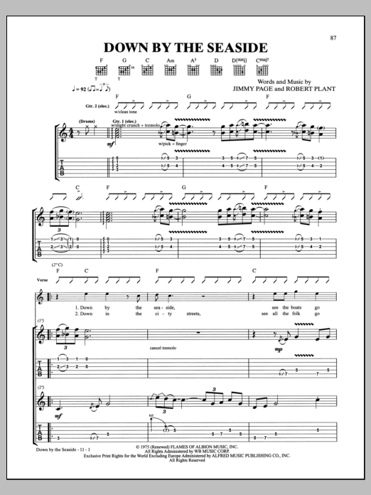 Download or print Led Zeppelin Down By The Seaside sheet music, chords and digital score arranged for Guitar Tab. This Pop score includes 11 page(s).