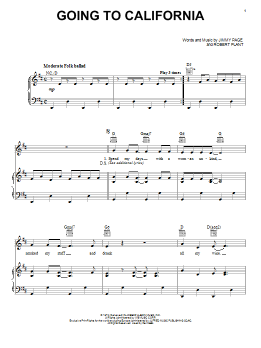 Download or print Led Zeppelin Going To California sheet music, chords and digital score arranged for Guitar Tab. This Rock score includes 8 page(s).