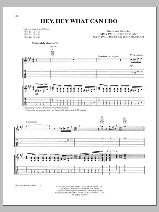 Download or print Led Zeppelin Hey, Hey What Can I Do sheet music, chords and digital score arranged for Guitar Tab. This Pop score includes 15 page(s).