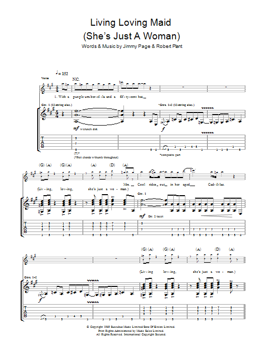 Download or print Led Zeppelin Living Loving Maid (She's Just A Woman) sheet music, chords and digital score arranged for Guitar Tab. This Rock score includes 6 page(s).
