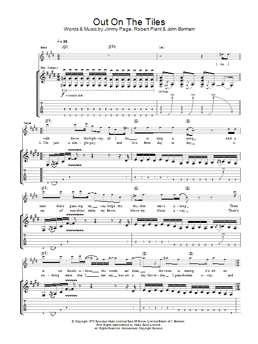 Download or print Led Zeppelin Out On The Tiles sheet music, chords and digital score arranged for Guitar Tab. This Rock score includes 4 page(s).