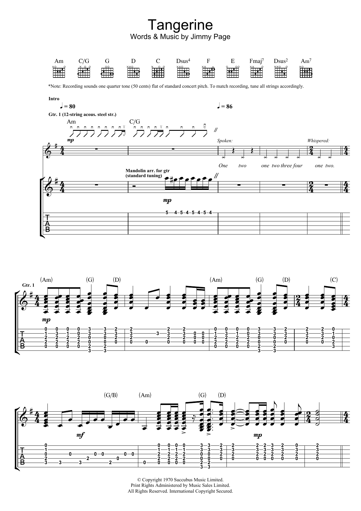 Download or print Led Zeppelin Tangerine sheet music, chords and digital score arranged for Guitar Tab. This Pop score includes 6 page(s).