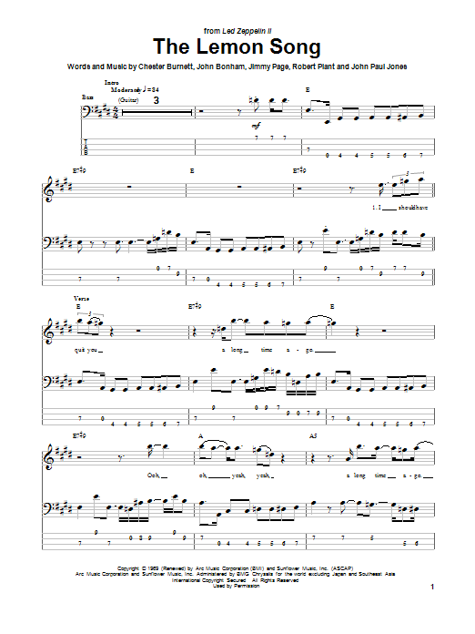 Download or print Led Zeppelin The Lemon Song sheet music, chords and digital score arranged for Bass Guitar Tab. This Blues score includes 15 page(s).