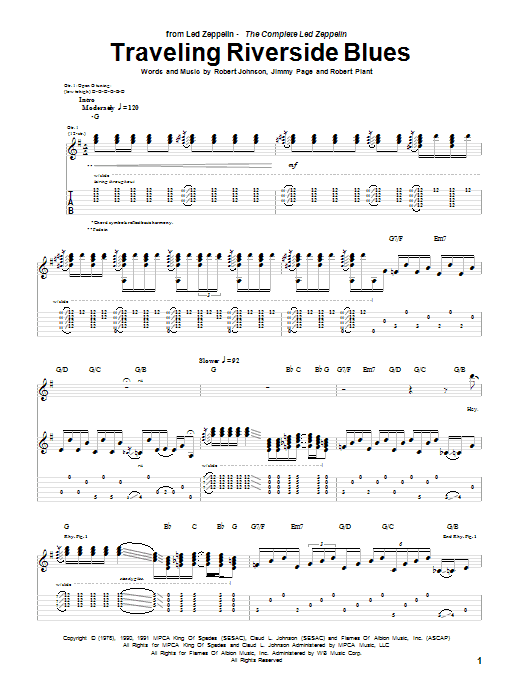 Download or print Led Zeppelin Traveling Riverside Blues sheet music, chords and digital score arranged for Guitar Tab. This Blues score includes 10 page(s).