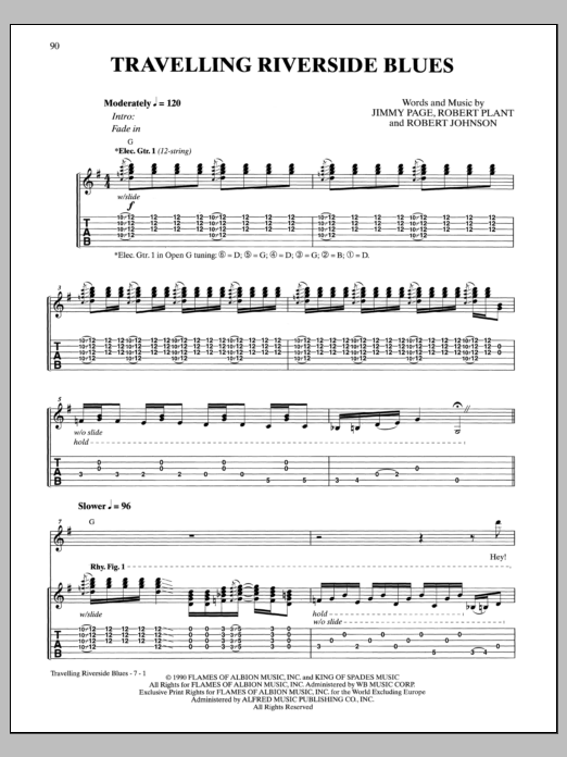 Download or print Led Zeppelin Travelling Riverside Blues sheet music, chords and digital score arranged for Guitar Tab. This Pop score includes 7 page(s).