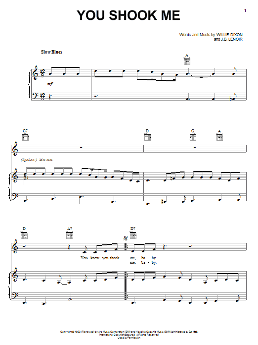 Download or print Led Zeppelin You Shook Me sheet music, chords and digital score arranged for Guitar Chords/Lyrics. This Blues score includes 3 page(s).
