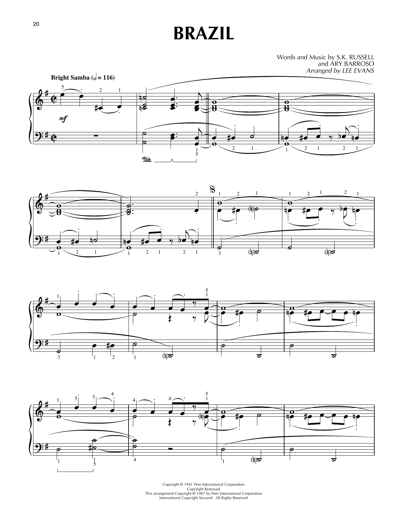 Download or print Lee Evans Brazil sheet music, chords and digital score arranged for Piano Solo. This Jazz score includes 5 page(s).