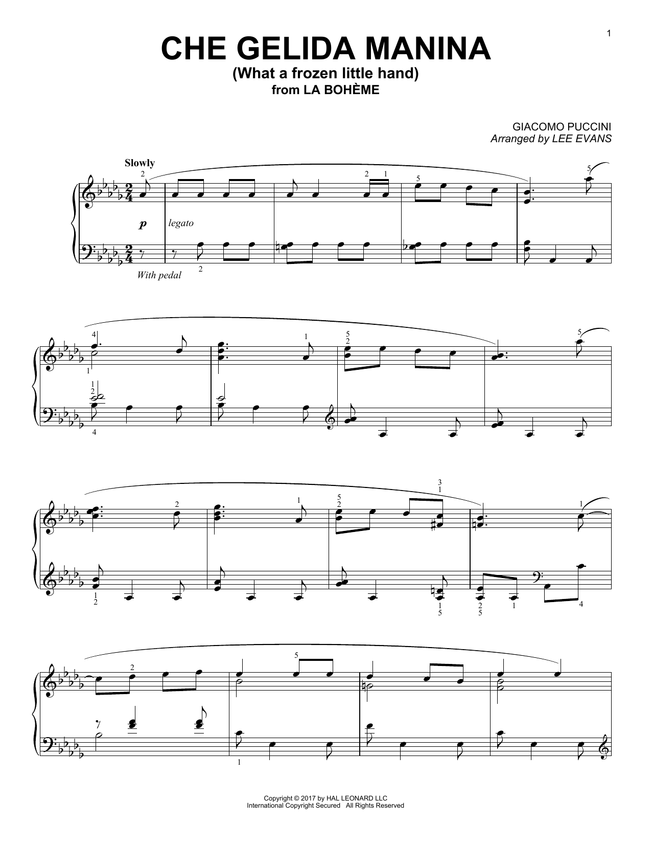Download or print Giacomo Puccini Che gelida manina from La Bohème (arr. Lee Evans) sheet music, chords and digital score arranged for Piano Solo. This Classical score includes 4 page(s).