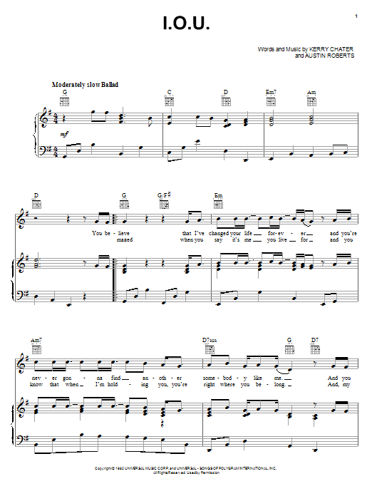 Download or print Lee Greenwood I.O.U. sheet music, chords and digital score arranged for Easy Piano. This Pop score includes 3 page(s).
