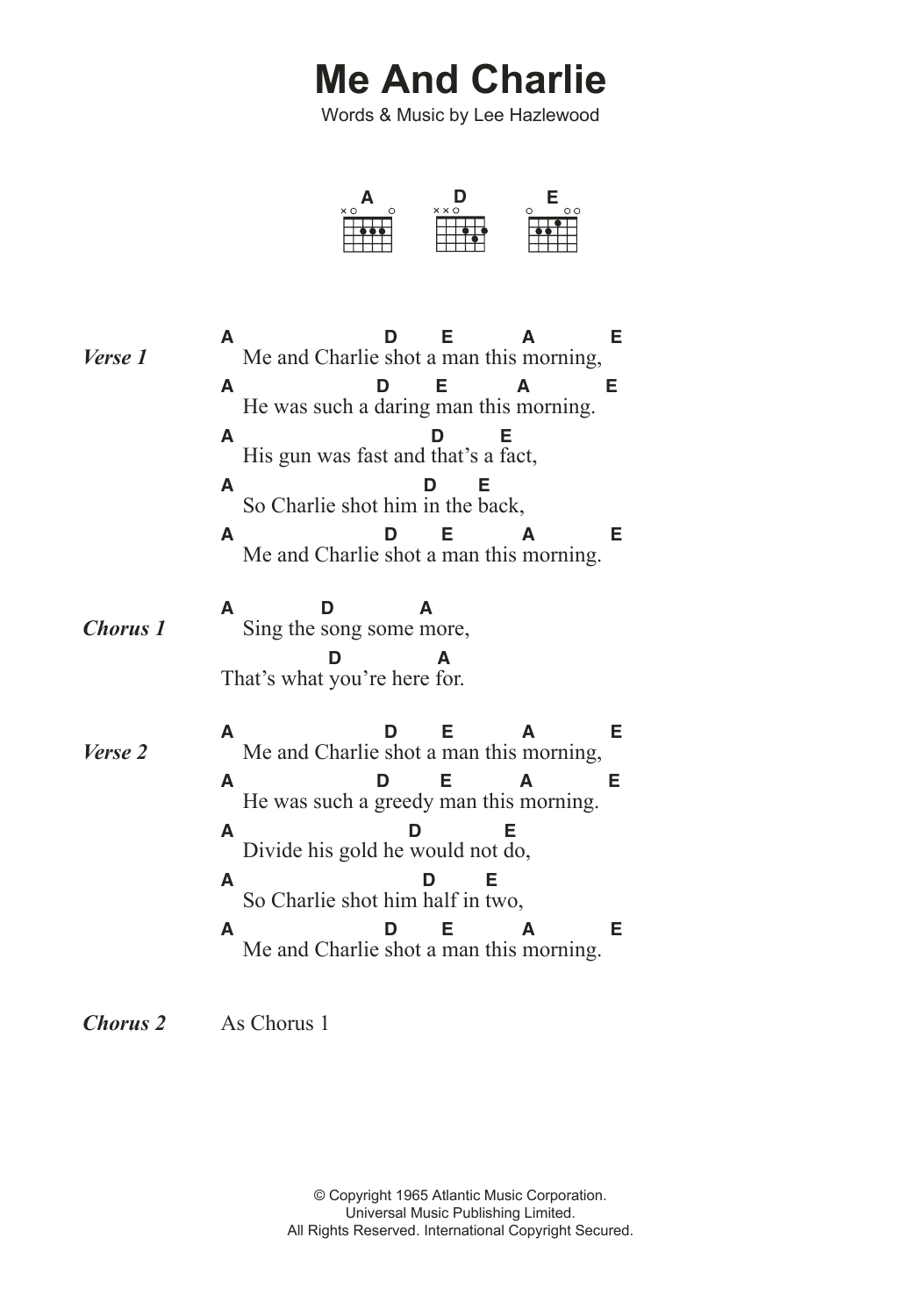 Download or print Lee Hazlewood Me And Charlie sheet music, chords and digital score arranged for Guitar Chords/Lyrics. This Pop score includes 2 page(s).