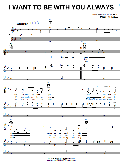 Download or print Lefty Frizzell I Want To Be With You Always sheet music, chords and digital score arranged for Lead Sheet / Fake Book. This Country score includes 1 page(s).