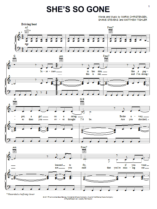 Download or print Lemonade Mouth (Movie) She's So Gone sheet music, chords and digital score arranged for Piano, Vocal & Guitar Chords (Right-Hand Melody). This Children score includes 6 page(s).