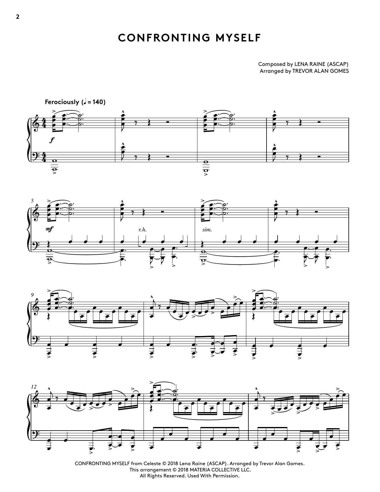 Download or print Lena Raine Confronting Myself (from Celeste Piano Collections) (arr. Trevor Alan Gomes) sheet music, chords and digital score arranged for Piano Solo. This Video Game score includes 7 page(s).