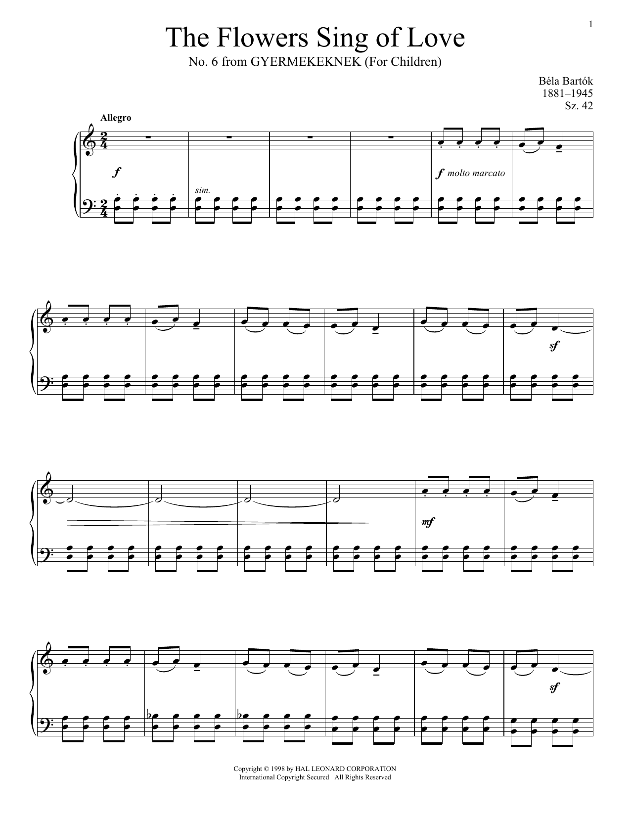 Download or print Béla Bartók The Flowers Sing Of Love sheet music, chords and digital score arranged for Piano Solo. This Classical score includes 2 page(s).