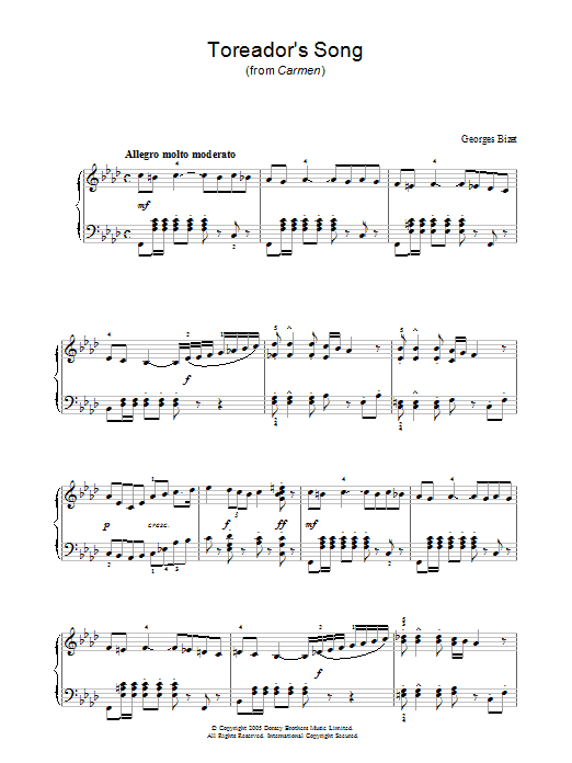 Download or print Georges Bizet Toreador Song sheet music, chords and digital score arranged for Piano Solo. This Classical score includes 3 page(s).