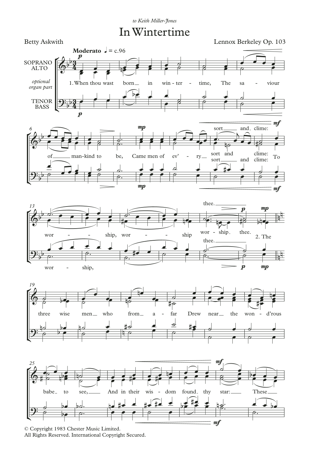 Download or print Lennox Berkeley In Wintertime sheet music, chords and digital score arranged for SATB Choir. This Christmas score includes 2 page(s).
