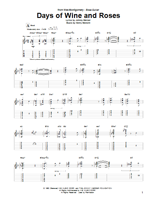 Download or print Wes Montgomery Days Of Wine And Roses sheet music, chords and digital score arranged for Guitar Tab (Single Guitar). This Jazz score includes 6 page(s).