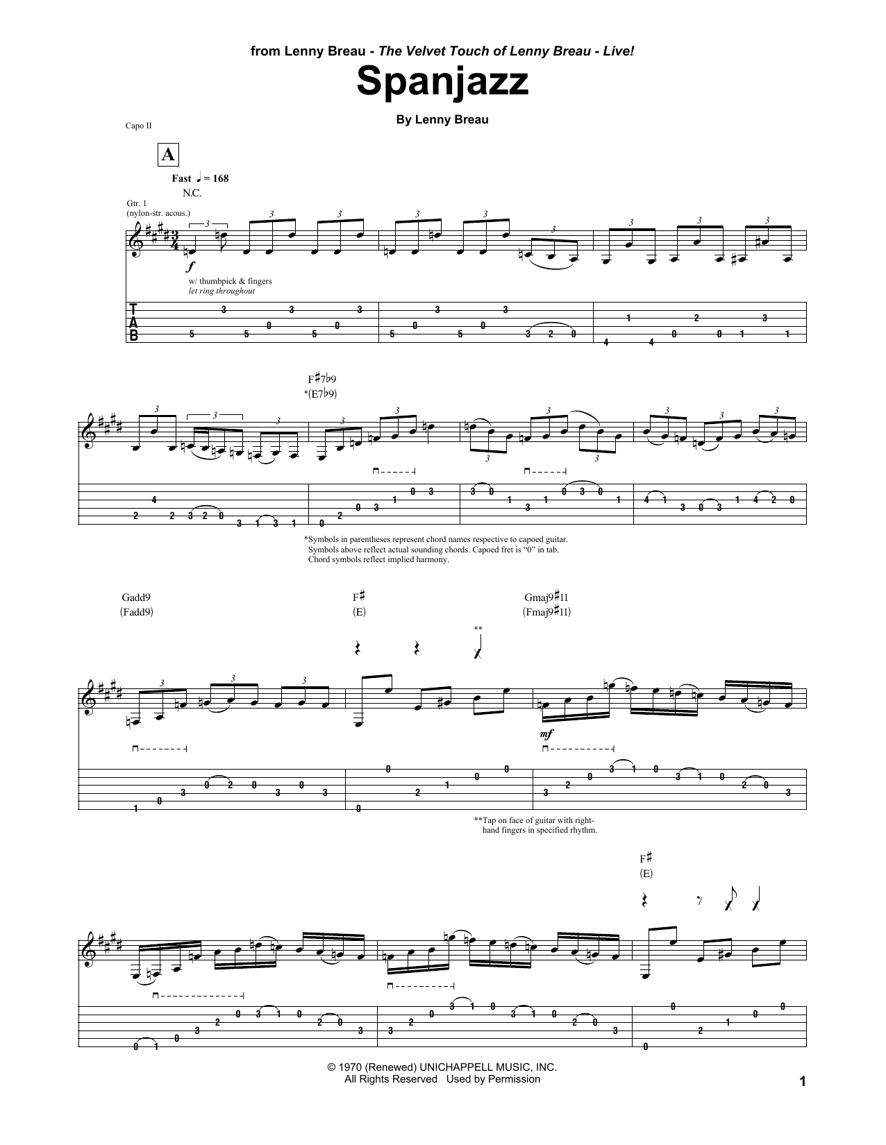 Download or print Lenny Breau Spanjazz sheet music, chords and digital score arranged for Guitar Tab. This Jazz score includes 15 page(s).